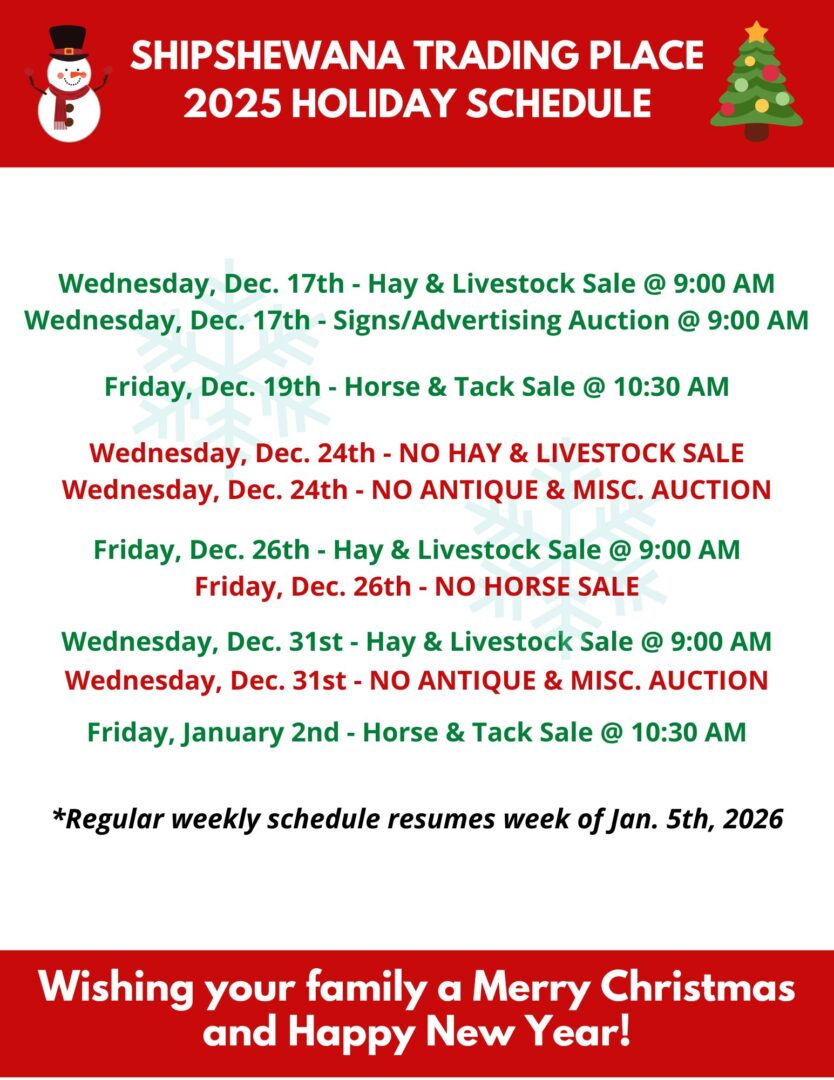 Every Wednesday starting at 9:00 am. Selling Hay, Feeder Pigs, Dairy Heifers, Feeder Cattle, Veal, Sheep, Lambs, Goats, Butcher Bulls and Cows/Fat Cattle.